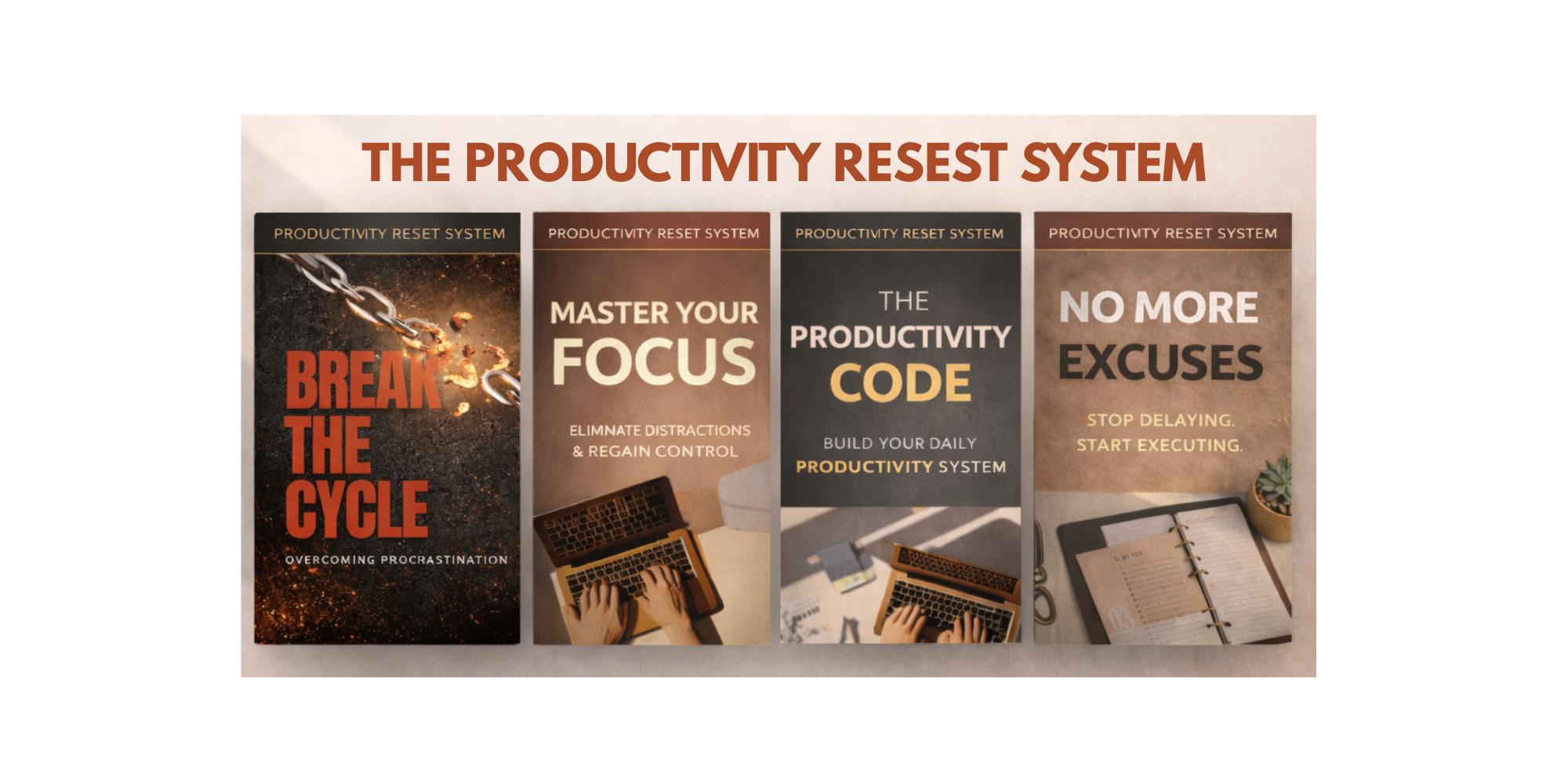 Productivity Reset is a complete system made up of focused guides and practical tools — each designed to solve a specific part of the procrastination cycle, in the order you actually need them.
